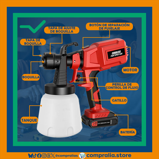 Pistola de Pintura Inalámbrica 21V | Recargable, Potente y con 3 Modos de Rociado | 800 ml | Ideal para Madera, Muro y Automotriz